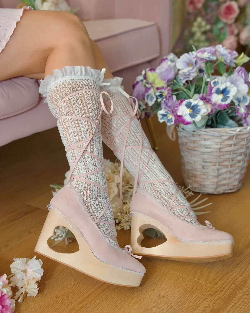 “Cupid’s Ballerina” Heart Platform Lace Up Shoes - Powder Pink from Vina of the Valley